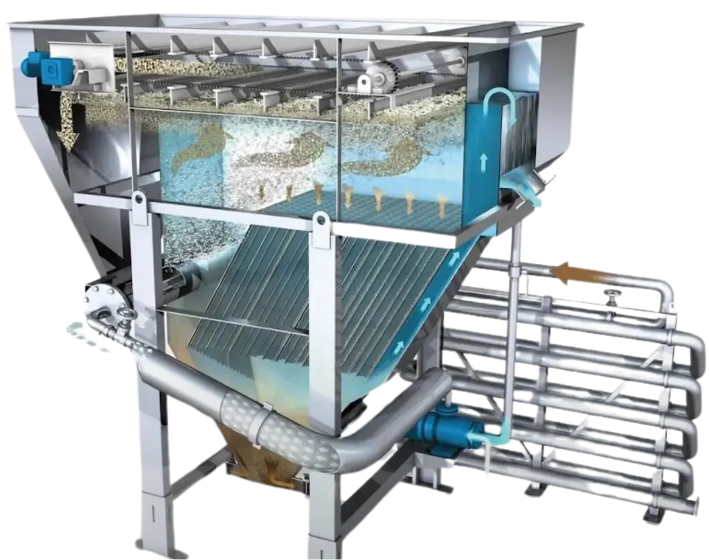 - Çöktürme / Lamella Sedimentasyon – Yüzeysel hız 0,7-1,0 m h⁻¹. Eğimli plaka modülleri çamur tabakasını kısaltarak hacmi %60 azaltır.