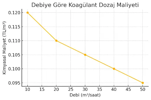 Yukarıdaki çizelge, 10-50 m³ h⁻¹ aralığında debi arttıkça koagülant dozaj maliyetinin TL m⁻³ bazında %20’ye varan oranlarda düştüğünü gösterir. Ölçek ekonomisi sayesinde yüksek kapasiteli tesisler daha kısa geri ödeme süresi elde eder.